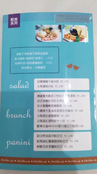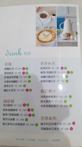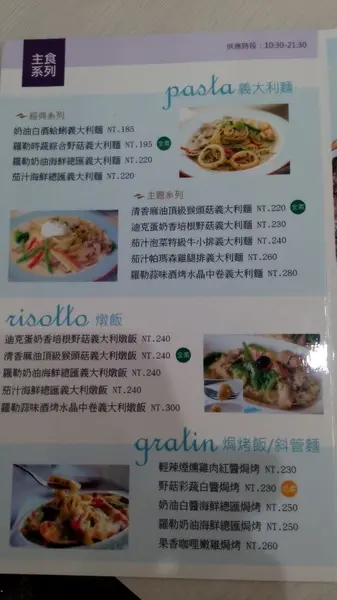主要是提供義式:義大利麵、燉飯、西式:牛排套餐、鬆餅、輕食及飲品。