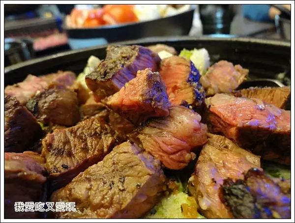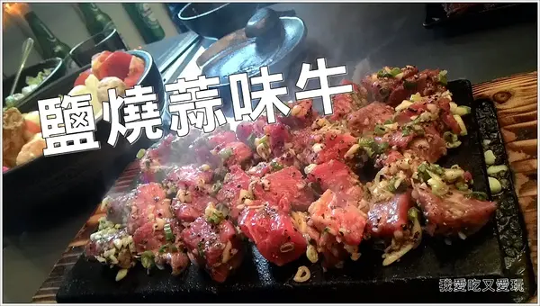 先將每塊大的有點過份的骰子牛放上石盤上烤,隨著高溫加上滿滿蔥花、蒜茉在盤上散發濃濃的香蒜味