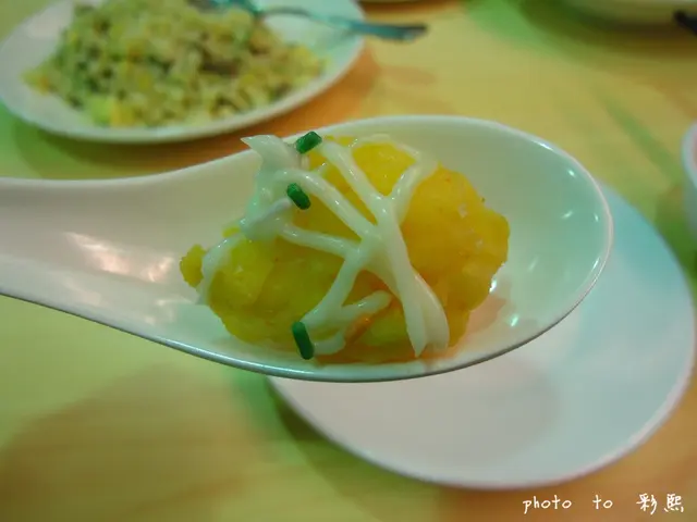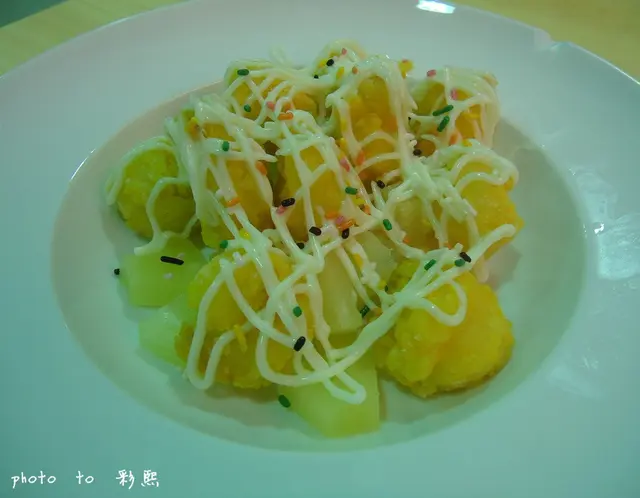 蝦球外皮酥酥的、不油膩,搭配沙拉跟鳳梨吃起來蠻爽口的~