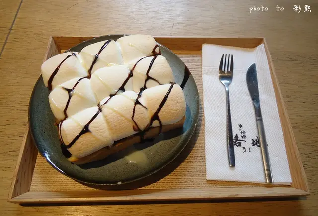 棉花糖烤的外酥內軟~ 裡面加了香蕉片~ 上面淋上了巧克力醬跟煉乳~