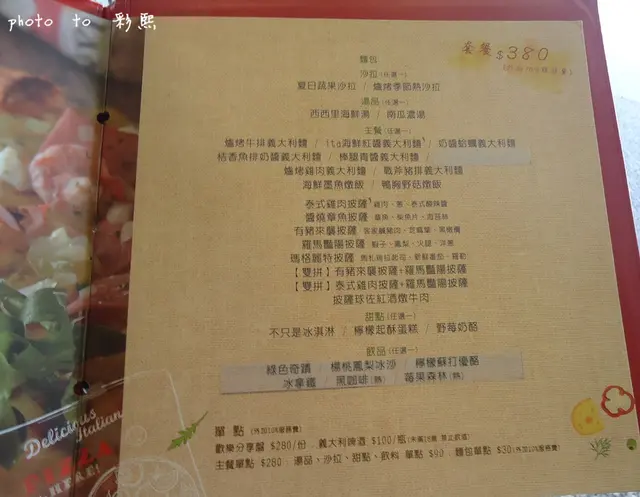 套餐380元+10%(麵包+沙拉+湯品+主餐+甜點+飲品)