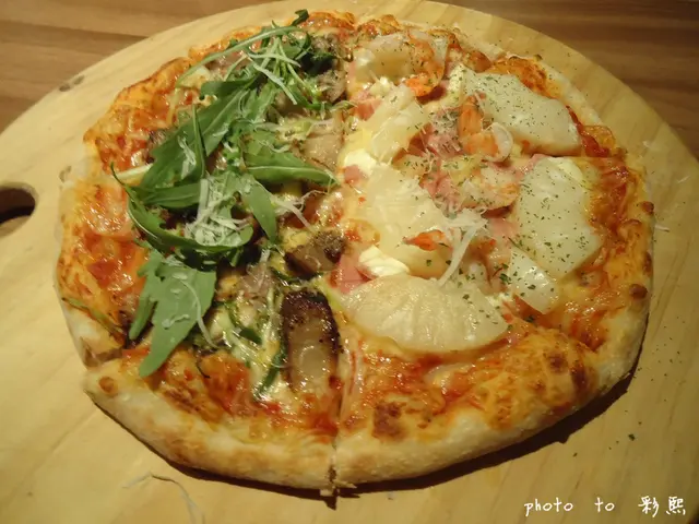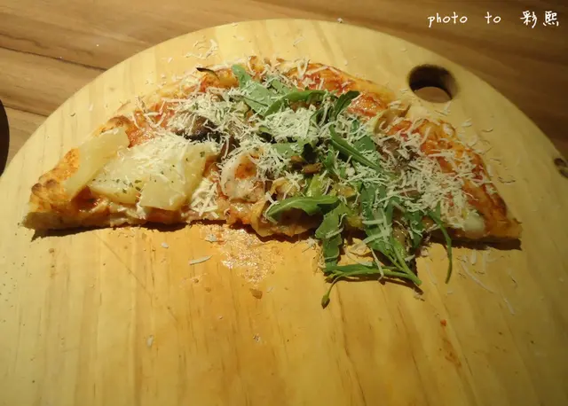 羅馬豔陽比薩:上面加了鳳梨、蝦仁、火腿...,底部是茄汁醬汁 加上鳳梨 吃起來酸酸甜甜的