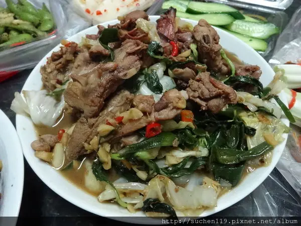 然後就是把鴨骨頭的部份用大量的蒜頭.葱.九層塔搭配上大火快炒