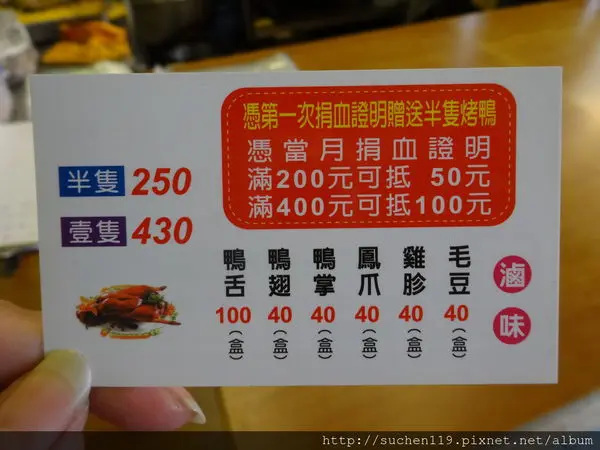 而十二月期間【九合脆皮烤鴨】更推出限時烤火雞特賣,重達6公斤的烤火雞特別經過按摩拍打的放鬆肉質手法,再以中式掛爐方式,烤出柔嫩多汁的口感,搭配一瓶紅酒、A1牛排醬、黑胡椒醬及特調胡椒鹽,只要1880元就能享受極富聖誕風情的美味烤火雞大餐,需要三天前預訂。 【九合脆皮烤鴨】推薦一鴨兩吃,經典的「烤鴨夾餅」薄而Q彈的餅皮是店家獨創精準比例自行製作的,配上醬汁及青蔥等食材,呈現完美風味,來店上網打卡還送小黃瓜一份,夾入鴨肉烤餅中滋味則是清甜解膩。「炒鴨」則是以蒜、辣椒、蔥、九層塔大火爆炒,香氣令人垂涎,也可再加購高麗菜一起炒,當季的鮮甜蔬菜吸收肉汁後,可是老饕最愛。滷味也是人氣商品,如鴨舌、鳳爪、鴨翅、鴨掌、雞胗及毛豆等,以中藥配方精心燉煮而成,除了到店採購,也可透過電話訂購宅配寄送。 更特別的是【九合脆皮烤鴨】長期鼓勵捐血行動,不但不定時會請捐血車前來店點,只要捐血就可獲贈半隻烤鴨,而平日只要憑著捐血報告,首次捐血者也有免費的半隻烤鴨,定期捐血者也憑捐血報告不論次數獲得全隻烤鴨折價100元、半隻烤鴨折價50元的優惠,甚具意義。◎體驗內容