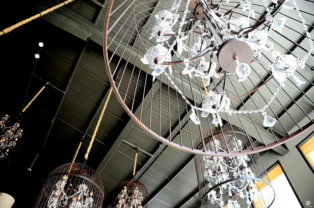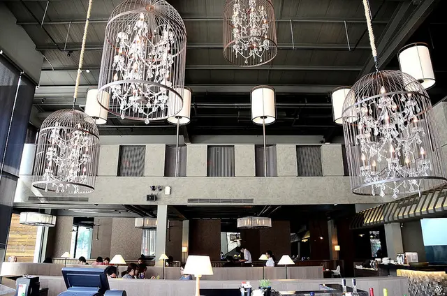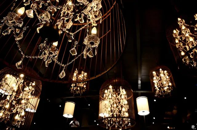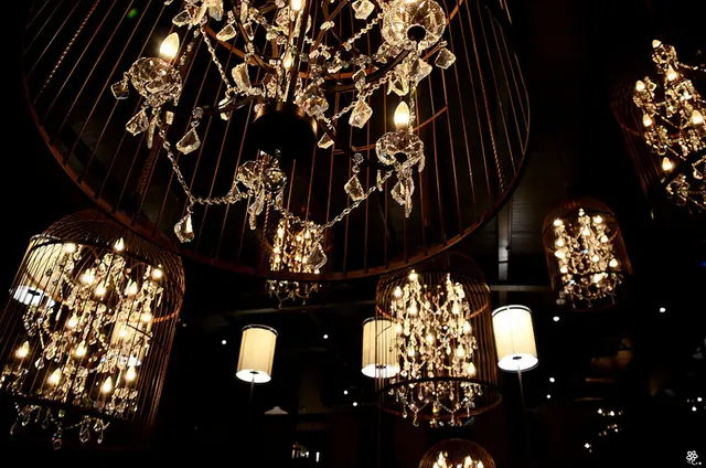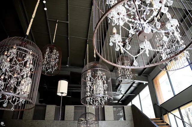 粗繩懸掛的鳥籠式燈罩裡,內嵌華麗透徹水晶燈,