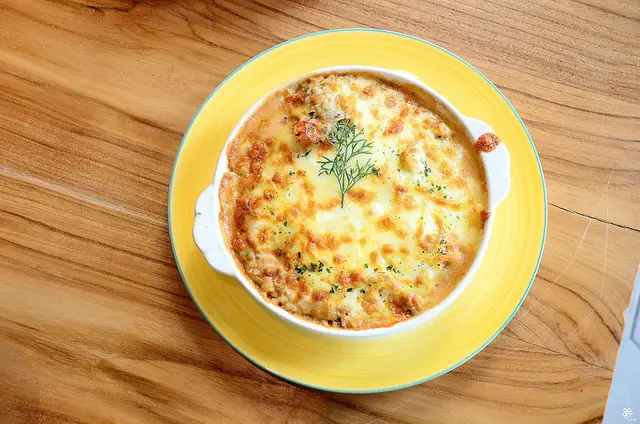 厚實的起司底下,鋪滿了扇貝、鮮蝦等海鮮食材和非常入味的燉飯,