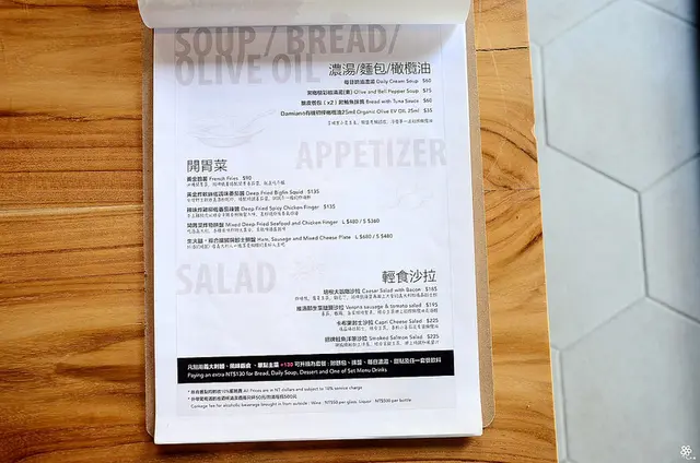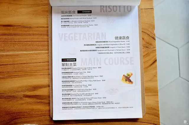 凡是點義大利麵、風味飯食或單點主菜,再加$130可升級為套餐,享有麵包、抹醬、每日濃湯、甜點和任一套餐飲料,