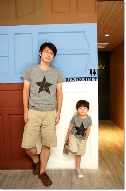 我最愛的拍照點就是往「廁所」走道前的牆面,Oh...這大帥+小帥~好像在拍雜誌喲