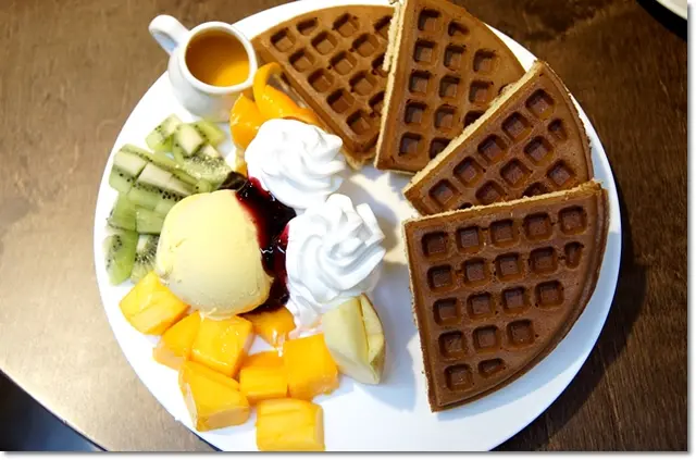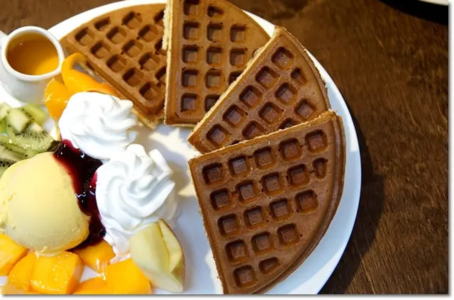 鬆餅口感並非Q彈厚實、咬下去是比較鬆軟些,但好加在不會乾乾的,所以抹些冰淇淋或奶油就很順口