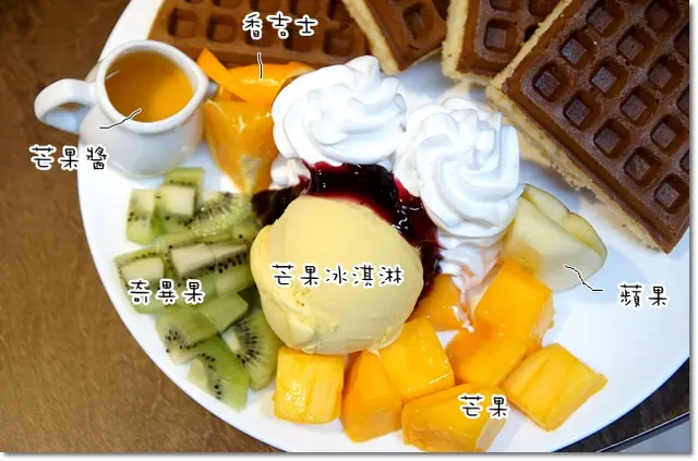 另外,特別的是一般常見是用楓糖漿or蜂蜜做沾醬,這兒的是提供當季水果的芒果醬,也好吃!