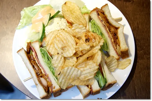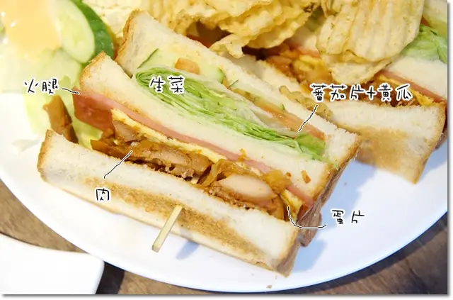 看起來份量依舊是澎派的餐點,有3塊三明治及新鮮生菜、蛋沙拉及不少的洋芋片