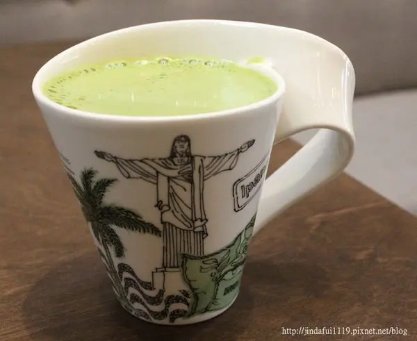 抹茶歐雷一登場先被杯子的樣貌給登愣了一下,造型很特別,且圖案研判是巴西熱內盧的基督像,這種帶有旅行元素的物品總會讓我默默加分XD友人表示喝起來很順口好喝