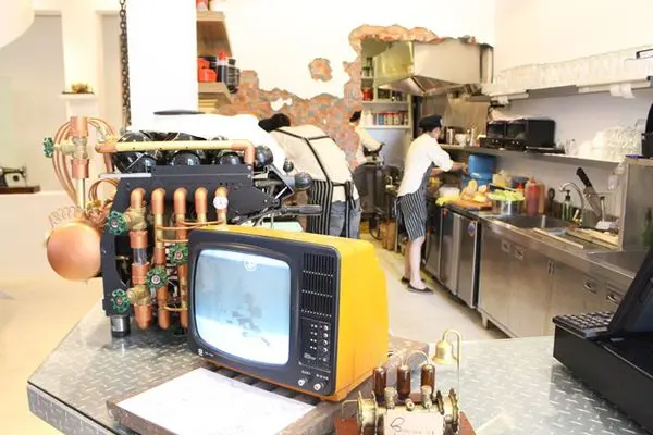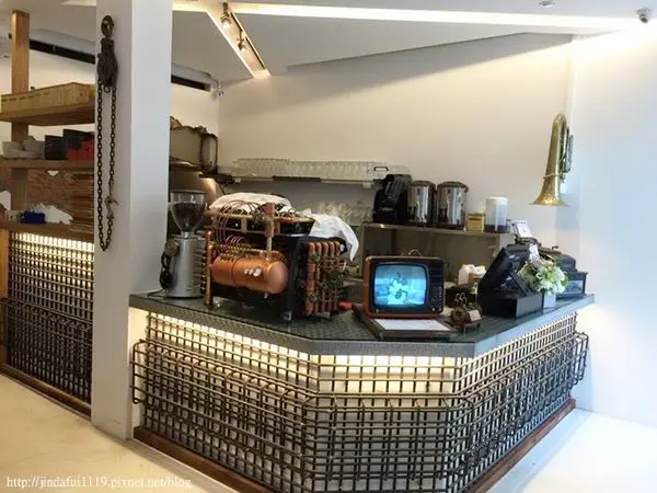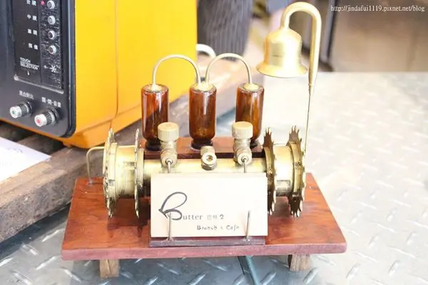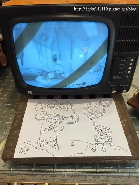 整個空間很明顯就是強烈的工業風,個人也算是造訪過不少工業風格的店家,Butter的吧檯排得上我喜歡的前幾名。與重金屬管線結合在一起的咖啡機應該是大部分的人第一眼會注意到的,這好像是我第一次看到連咖啡機也特地改造和店內風格一致的店家(嗯.....也或許有其他店也對咖啡機別有用心只是我沒印象,但我想Butter這台工業金屬咖啡機我會過目不忘,因為實在太搶眼了XD)雖然說工業的元素使用的很多,但整體感覺我部會覺得過硬,可能是店內環境以白色調為主,桌椅則是木頭來著,加上吧檯上的復古電視機播放著黑白懷舊的迪士尼米老鼠卡通而柔和了本該是剛硬的氛圍(我的觀察啦~~),若以四個字來形容Butter的感覺就是「鐵漢柔情」,跟我本人一樣,呵(哪來的臉講這種話?)