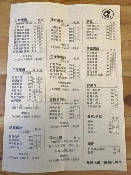 放眼望去,價格十分親民,比許多早午餐店都來得便宜,飲品最貴才一百元,餐點幾乎都在兩百塊以內。重點是Butter位在貴鬆鬆的美術館一帶,價格還能這般親切實屬感人(起立鼓掌)不過每個人的低消為一份餐點,用餐時間限制兩個小時,如果是想來找個店悠哉的看書喝咖啡Butter是不適合的。