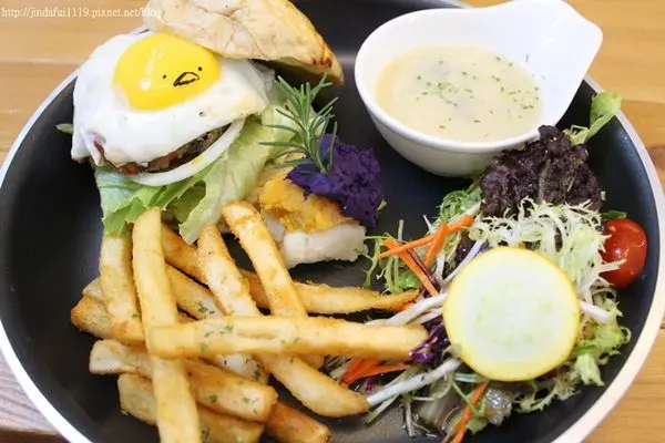 麵包的部分可以選擇漢堡、軟法、帕尼尼或貝果;附餐飲品則有美式咖啡、蜜紅茶和蜜奶茶,如果選其他飲品可折抵30塊。餐點內含生菜沙拉、濃湯、脆薯和三色薯泥(由上至下:紫薯泥、地瓜泥、馬鈴薯泥)。生菜感覺得出來滿新鮮的,但醬汁淋得太少了,到後來好像只純呷菜而已;濃湯雖然喝起來還妥,但不是我喜歡的那種很濃郁的濃湯;薯條則炸得頗為酥脆,是這盤當中我認為的最佳配角。By the way ,有注意到盤子其實是本來是平底鍋嗎XD