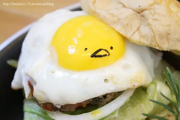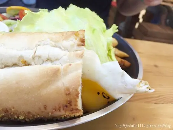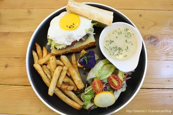 盤中物和我的幾乎一模一樣就不贅述了,只是友人麵包選擇軟法,蛋黃哥下面不是肉排而是雞柳。友人對於餐點的心得簡單的表示:「整體味道還好,不過吃好飽喔........其實份量不少欸.....」