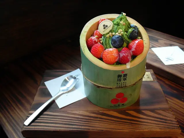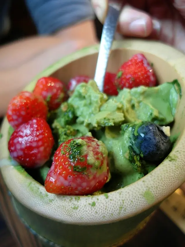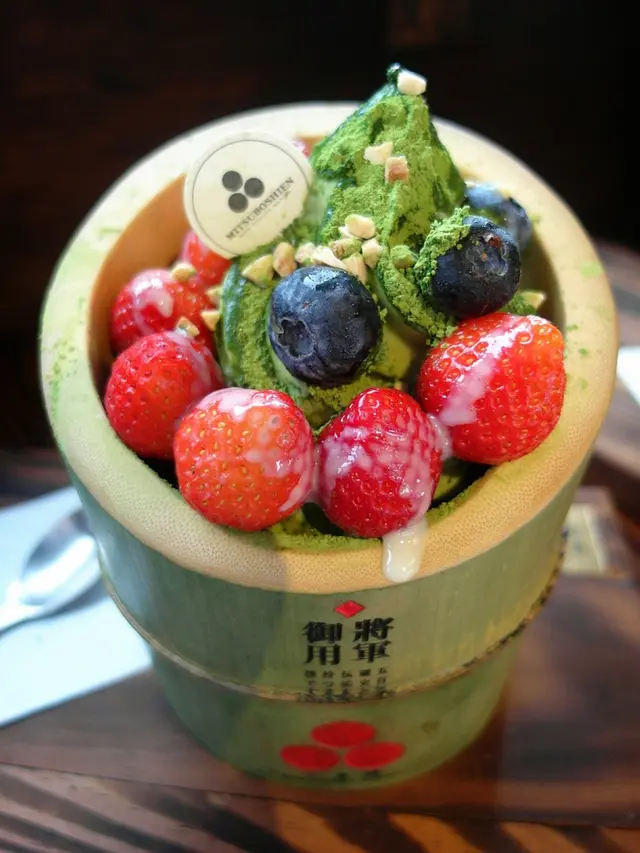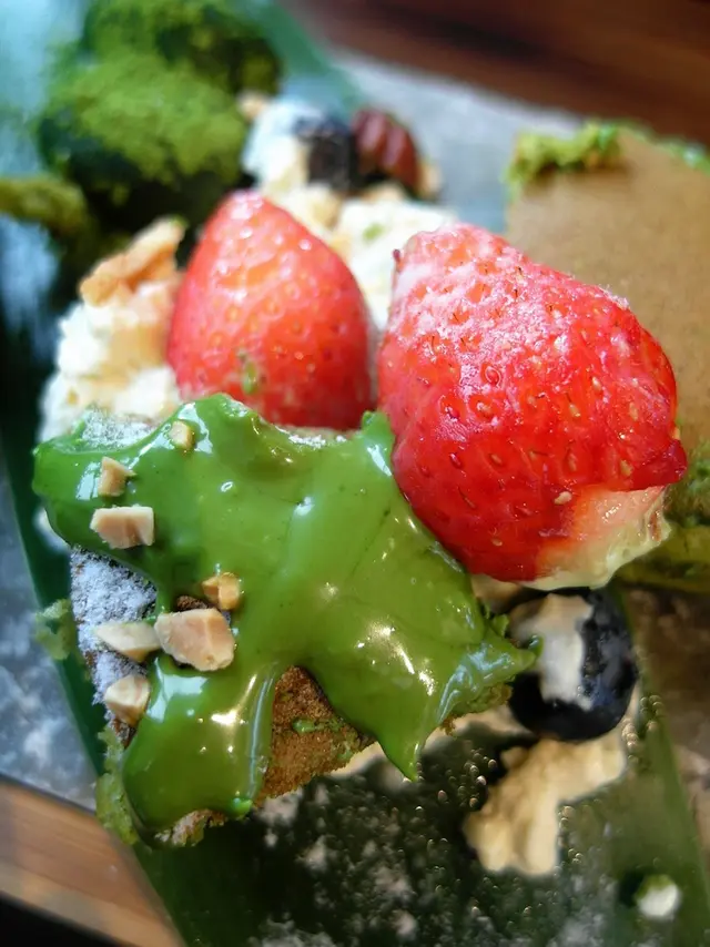 草莓給的蠻多顆的 還有藍莓 杏仁角 撒上抹茶粉 淋上煉乳