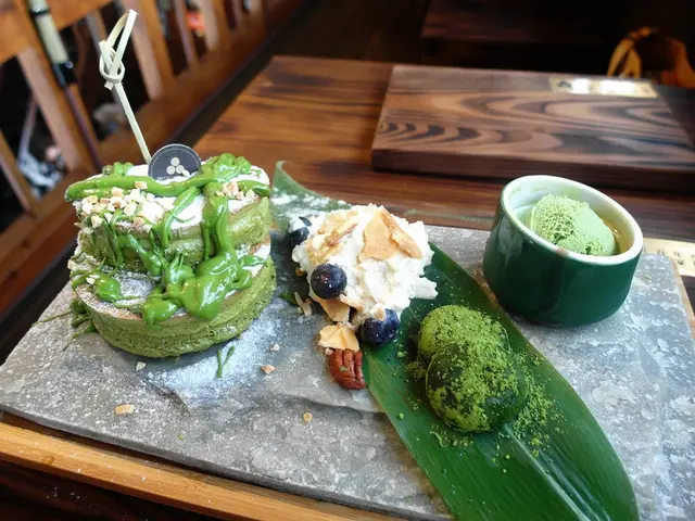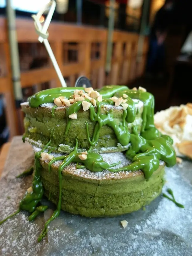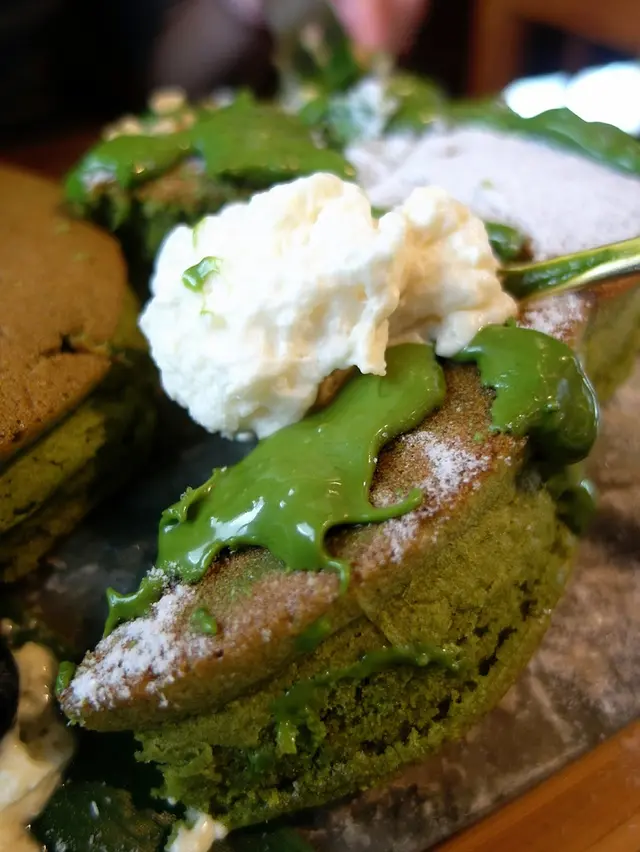 有兩大片後鬆餅 上面淋上滿滿的抹茶醬