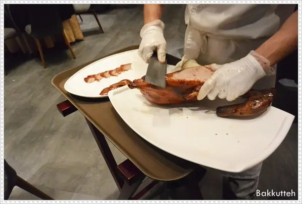 整隻烤鴨端到桌子旁邊 過不久就有廚師來切片囉