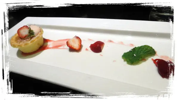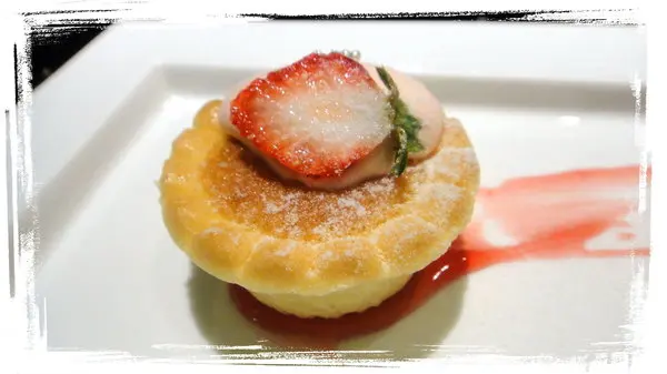 甜點來了~~這是草莓慕斯奶油塔~~擺盤很漂亮!!!雖然只有一小顆但很好吃!!