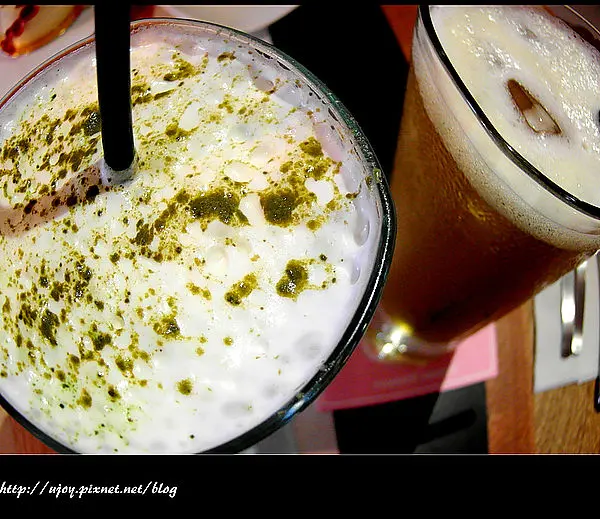 而我們這次點的飲料有抹茶歐蕾(偏甜!抹茶味足)(140元)以及白桃烏龍茶(真的有股淡淡桃香!)(130元),