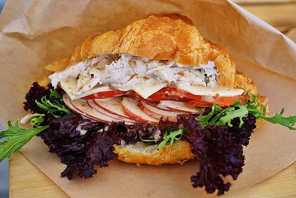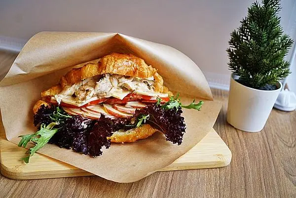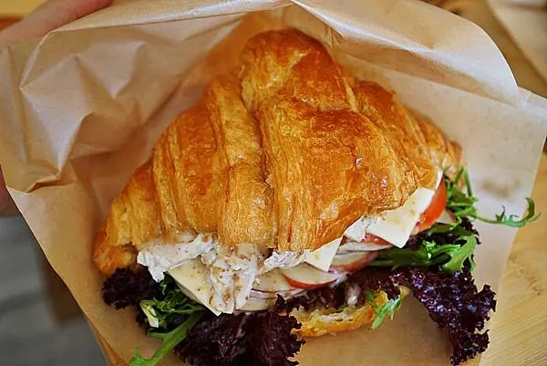 可頌裡放入了水煮雞胸肉 蘋果片 番茄 瑞士乾酪片 歐式生菜 並加入胡麻醬