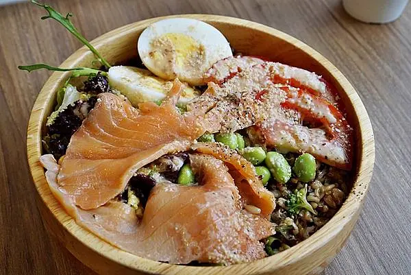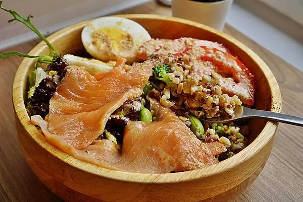 藜麥燕麥拌上蔬菜再加上水煮蛋跟煙燻鮭魚,根本減肥脫脂健身最佳飲食良伴。