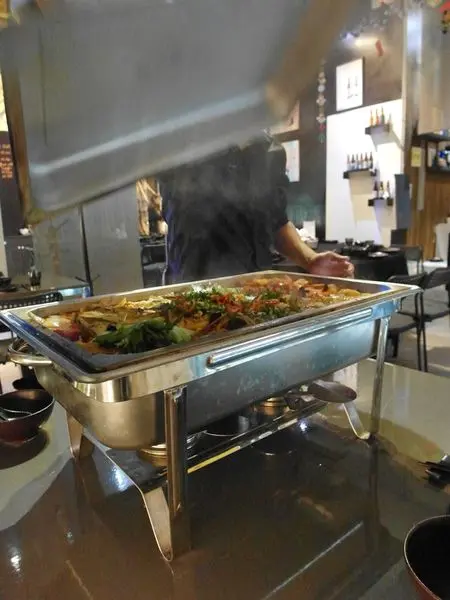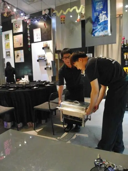 吃完沙拉後不久 就看到兩位男店員端著一盆光看就知道很重的鐵容器要上桌