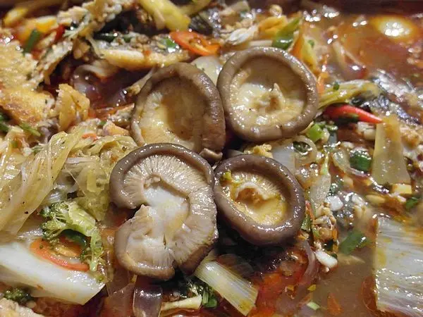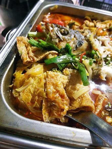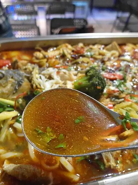 店家精燉的麻辣湯頭裡面有完整大尾鱸魚 還有滿滿滿的配料