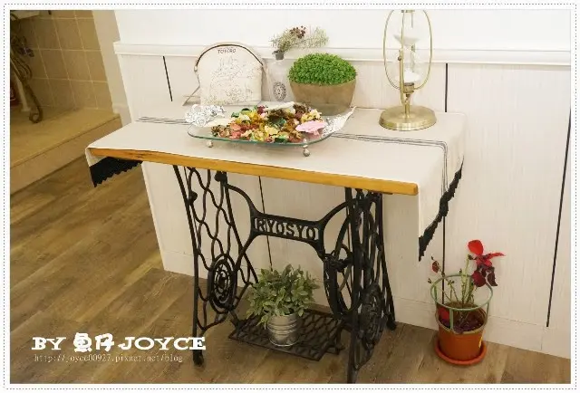 復古裁縫機上面擺有可以認購的手工拼布包,有興趣的可以來看看