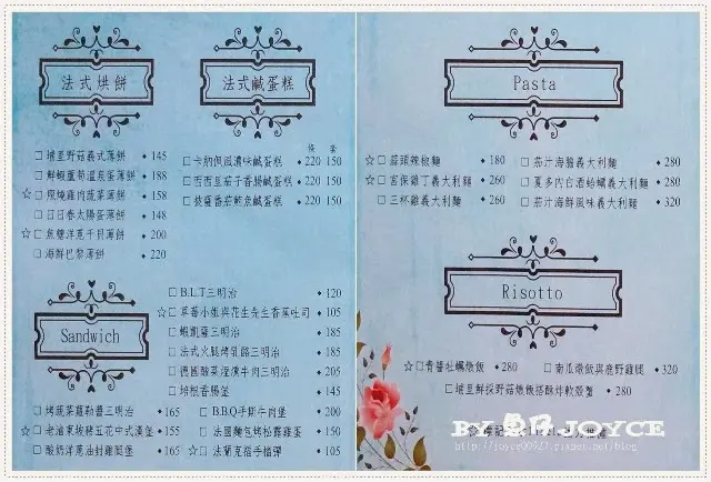 餐點有 法式烘餅、法式鹹蛋糕、三明治、義大利麵和燉飯