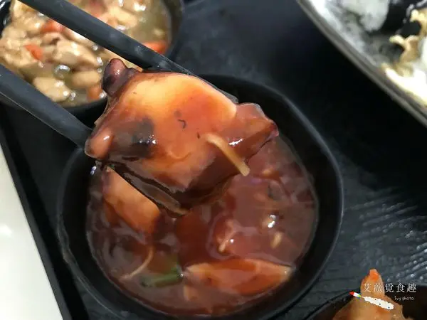 五味章魚醬料看起來很辣,其實像甜辣醬但甜度比較高些,章魚超大塊又有嚼勁,飯捲直接沾醬料入口,還蠻搭的
