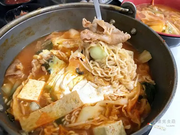 泡菜鍋的的份量很大,配料也超多有魚板、年糕、豆腐、豬肉片、青菜、蛤蜊、雞蛋、魷魚、泡菜和王子麵,竟然沒破百,超划算又實惠