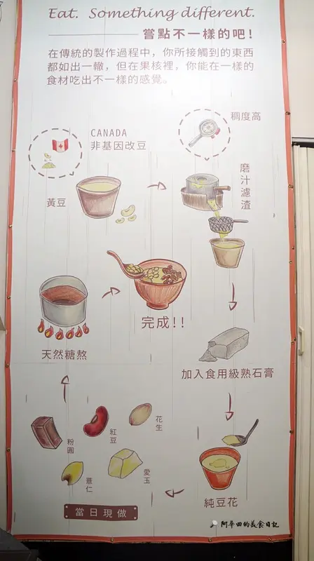▲Eat something different是果核豆花鄉的座右銘!嘗點不一樣的吧!使用非基因改良的黃豆,經過磨汁濾渣後,再加入可食用的熟石膏,純豆花就完成了,再來每日現做的配料,最後加入熬煮的糖水,大功告成!