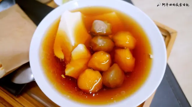 裡頭有七顆芋圓,黃色是地瓜圓,外皮非常嫩Q,地瓜圓裡面包芋泥,芋圓裡面包地瓜泥,互包的概念嗎?