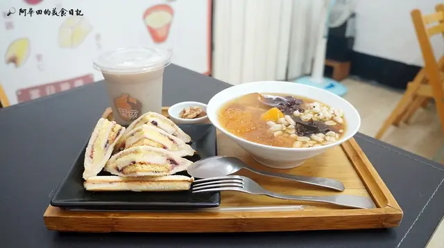 ▲有料芋圓+培根起司半熟蛋熱壓吐司+紅茶拿鐵