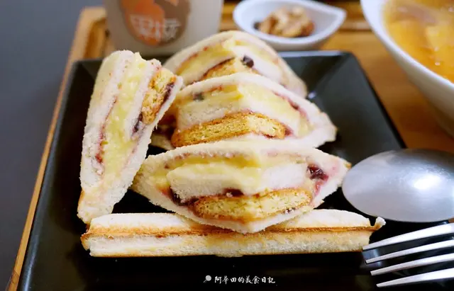 原本是想點兩個鹹的熱壓吐司,最後決定都試試看,裡頭居然有孔雀餅乾,整體是微酸的口感,帶點檸檬的清香,裡頭還有藍莓醬,原本應該是用在蛋糕上的,沒想到用在熱壓吐司上,又有另一種感覺,還不錯。