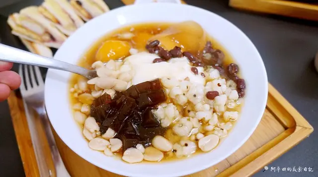 裡頭的配料有花生、薏仁、茶香紅豆、方塊粉圓、有料芋園、蜂蜜愛玉,六種滿滿的配料,真的是佛心來的,方塊粉圓有點像粉粿,口感是Q彈的,淡淡的黑糖香,整碗吃完非常有飽足感。