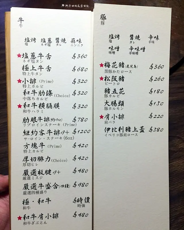 ▲牛、豚,牛肉部分口味有塩烤、塩蔥、醬燒、蒜味,而豚的部分有塩烤、醬燒、辛味、味噌、辛味噌