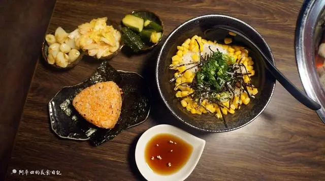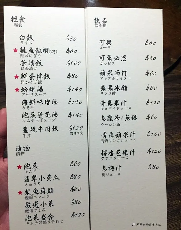 ▲泡菜盛合$120、鮭魚飯糰(烤)$60、鮮蛋拌飯$80