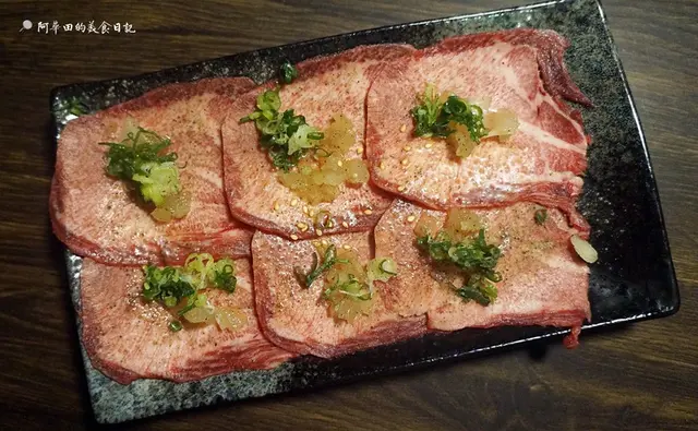採用牛舌後根部位,切成薄片,上頭再撒上塩蔥調味,再烤網上不用幾秒鐘,油脂香氣立馬撲鼻而來,口感脆脆的,是日本人吃燒肉最先習慣吃的第一道菜!
