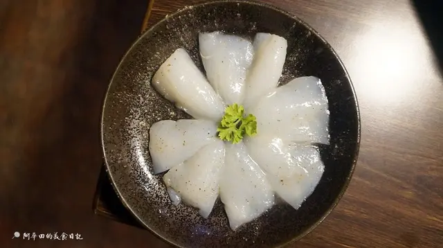 我是個很吃生魚片的人,當然要我生食花枝當然沒問題,沒想到生食還蠻鮮甜的,帶有一點嚼勁,烤過後就顯得清脆許多,一樣好吃~