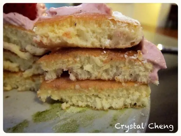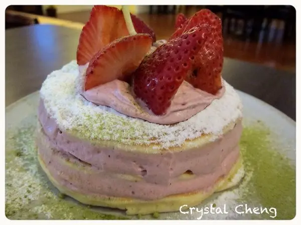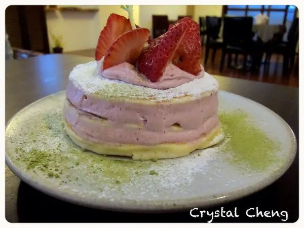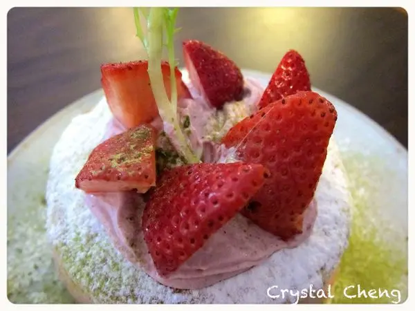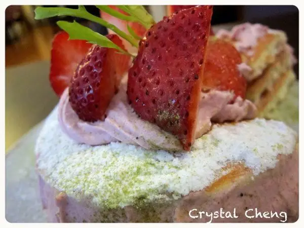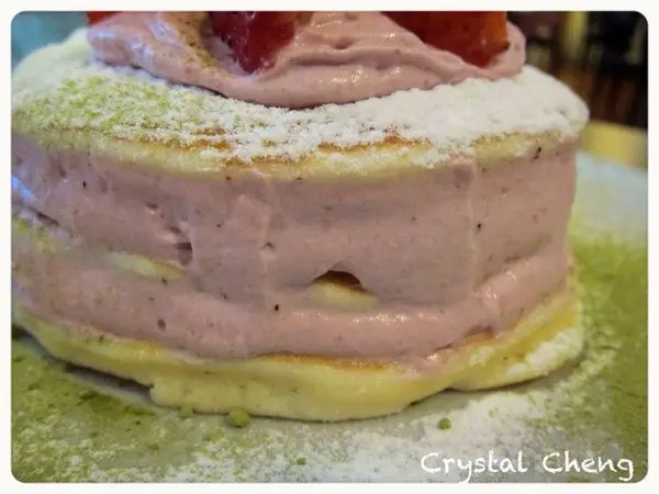 草莓慕斯包覆著整個鬆餅,除了撒上細糖粉,還有一些抹茶粉,