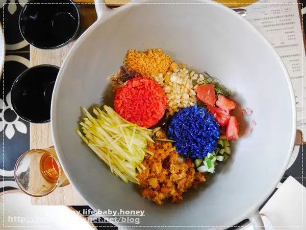 米沙拉的大碗裡有兩球飯,粉紅的是火龍果拌出來的,藍紫色則是蝶豆花
