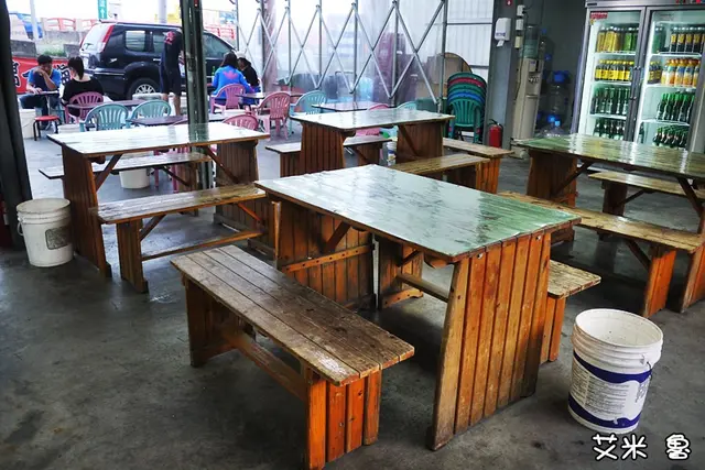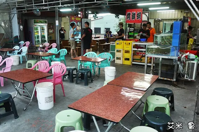 輕鬆簡易的座位桌椅,每桌都有專屬垃圾桶,讓你吃好料丟殼超方便