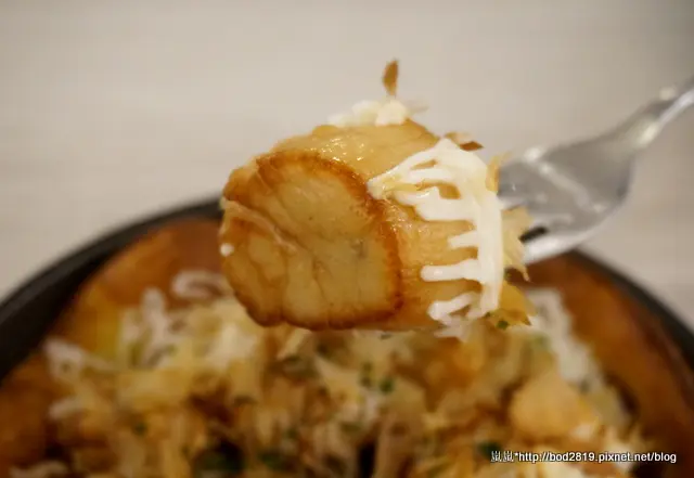 把料撥開可以看到黃澄澄的底,旁邊則是酥鬆的餅皮,