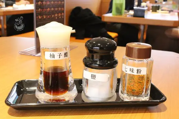 ▲每個座位都有調味料可供使用,分別是柚子醋 、鹽和七味粉,另外還有薑片和醬油等等