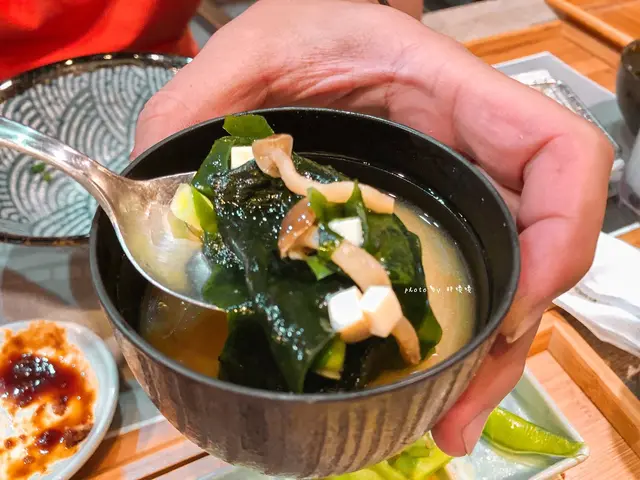 定食內容有主餐、白飯、三樣小菜、沾醬及湯品