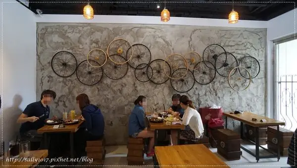 牆上掛著許多腳踏車鋁圈~~很有特色啊!!
