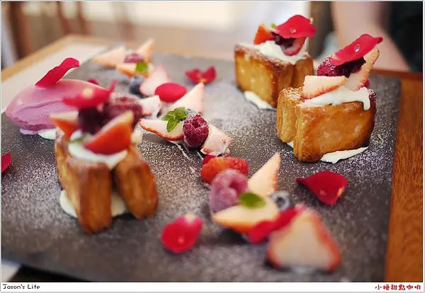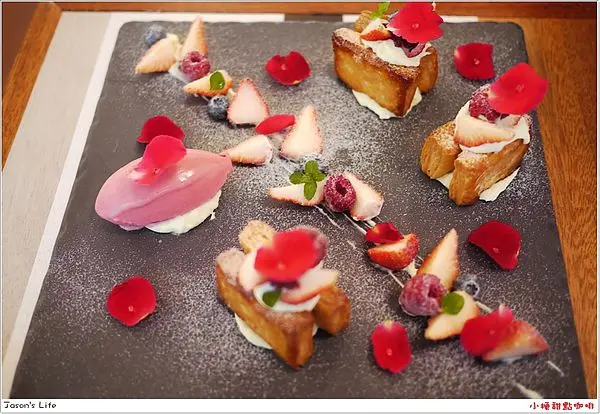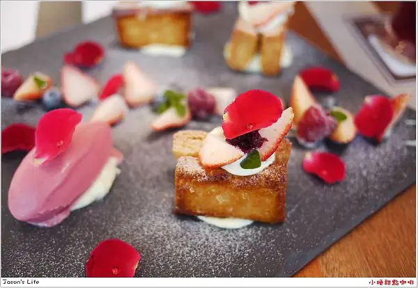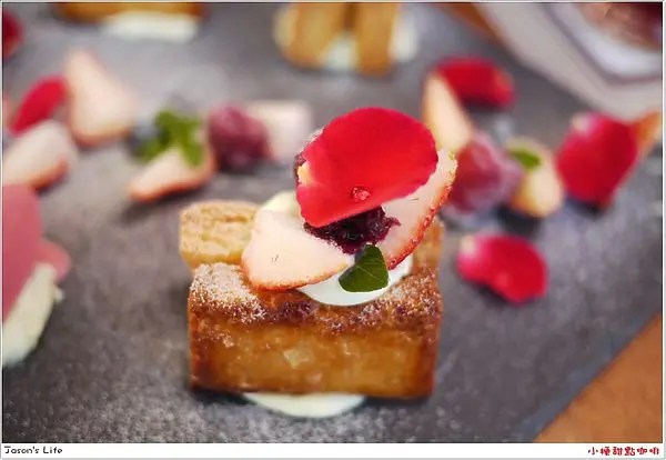 草莓千層派上還灑上玫瑰花瓣,每片花瓣點上果糖也是可以吃的喔